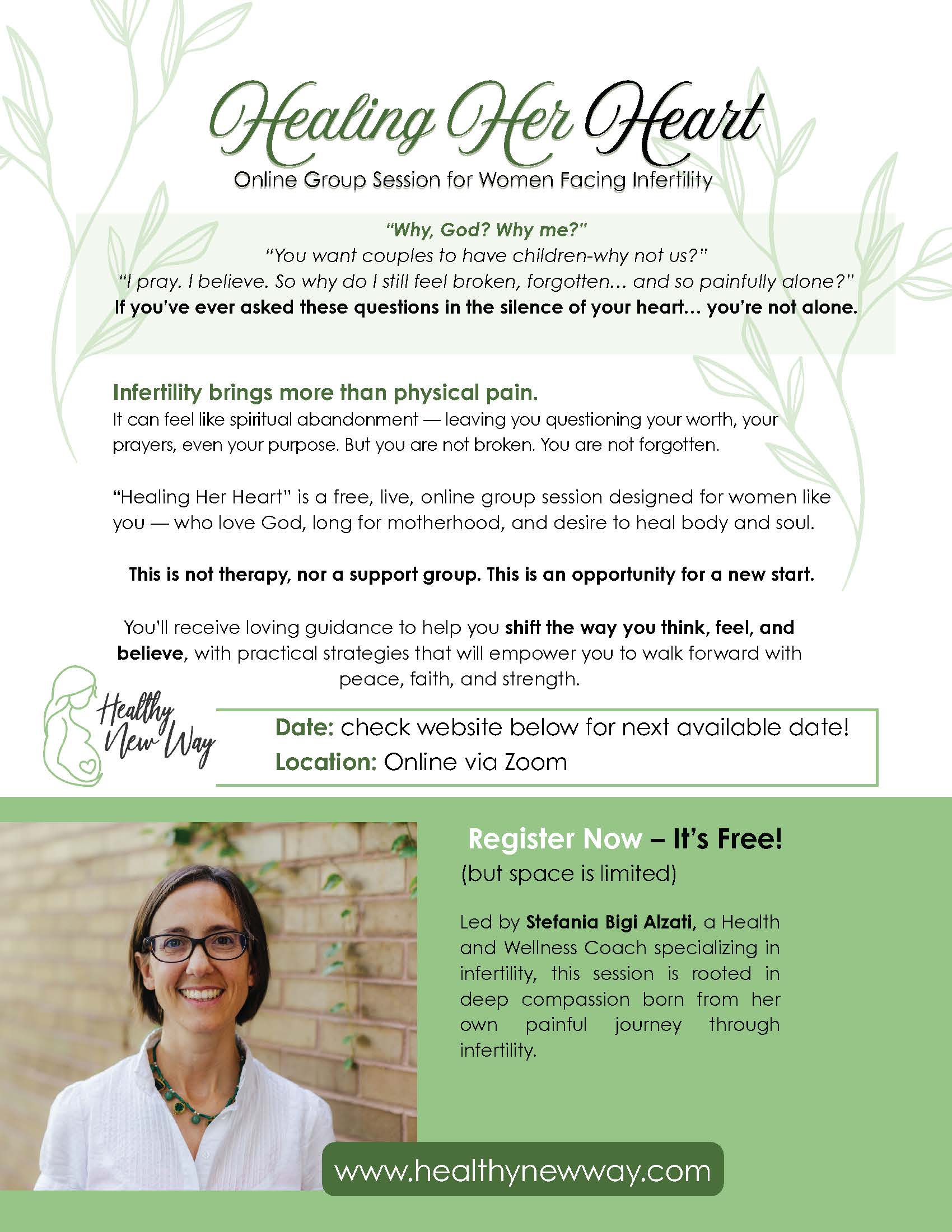 Stefania offers an online session, rooted in deep compassion born from her own painful journey through infertility: Healing Her Heart Flyer2